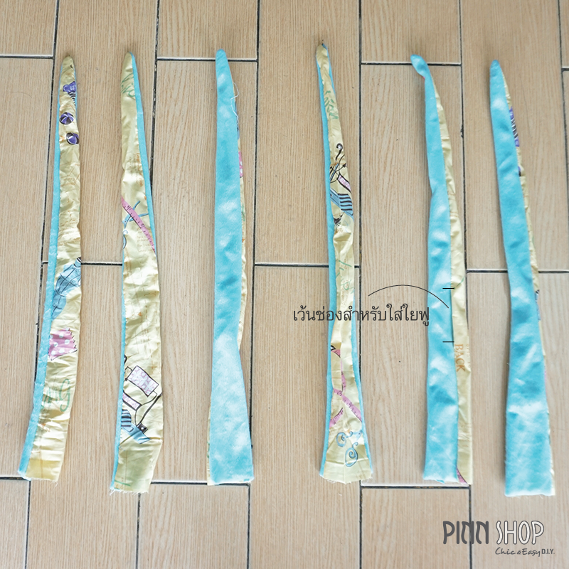 6. เย็บหนวดสั้น-หนวดยาว ตามแนวโค้งเว้นตรงปากท่อไว้ โดยเว้นช่องสำหรับใส่ใยฟูทุกชิ้น